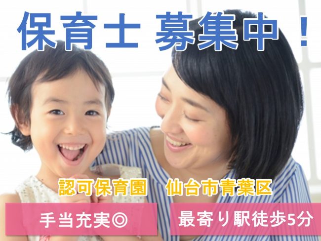 | 仕事内容 | ★ロリポップクラブマザリーズ電力ビル園★ 保育士として業務にあたっていただきます♪ 【具体的な仕事内容】 ・0歳児~就学前までの乳幼児の保育 ・定員59名の認可保育所でのお仕事です。 *転勤の可能性あり:仙台市内(青葉区・太白区)にある姉妹園への転勤の場合あり |