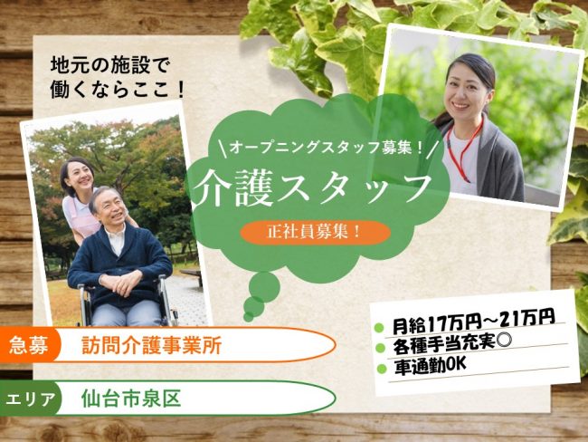 | 仕事内容 | ★ココロハウス仙台泉★ ◎サービス付き高齢者向け住宅併設の訪問介護事業所での介護サービスが主な業務となります ・排泄介助 ・食事介助 ・入浴介助等 ・その他付随する業務 *勤務は就業時間(1)から(4)のシフト勤務となります (4)のみ勤務の方も歓迎します *応募前の見学も可能です *未経験の方、ブランクのある方の応募も歓迎致します |