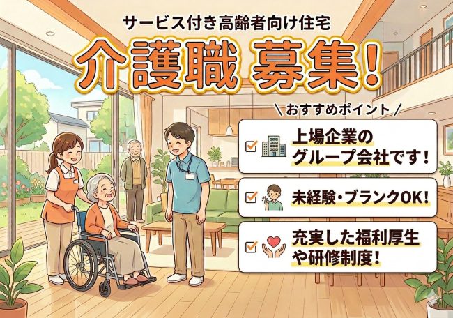| 仕事内容 | ★ライブラリ泉中央★ ◎介護スタッフとして業務に従事していただきます サービス付き高齢者向け住宅(定員80名)での「介護職員」としてのお仕事です。 お仕事内容は介護業務全般(早番、遅番、日勤、夜勤)となりますが、 先輩職員によるマンツーマンでのサポートがありますのでブランクがあったり、未経験の方でも安心してご応募ください。 |