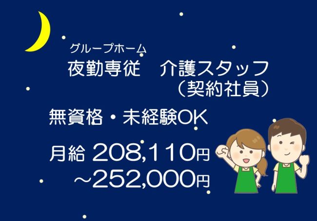| 仕事内容 | ★なんてん水の森公園★ 夜勤専従介護スタッフとして業務に従事していただきます♪ 【具体的な仕事内容】 認知症グループホームにおける介護業務 ・身体介助、トイレ誘導、食事介助、お風呂介助、その他生活全般に関するお手伝い ・1ユニットの利用者は9名 ・完全個室 |