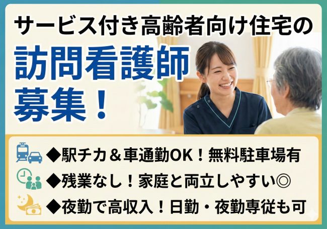 | 仕事内容 | ★ココロハウス仙台東★ サービス付き高齢者向け住宅併設の訪問看護での業務となります。 ・記録の作成、報告書等の作成、看護業務、その他付随する業務 ・ご利用者様の身体介助あり。 ※夜勤専従・日勤のみの歓迎致します。 ※応募前の見学も可能です。 |