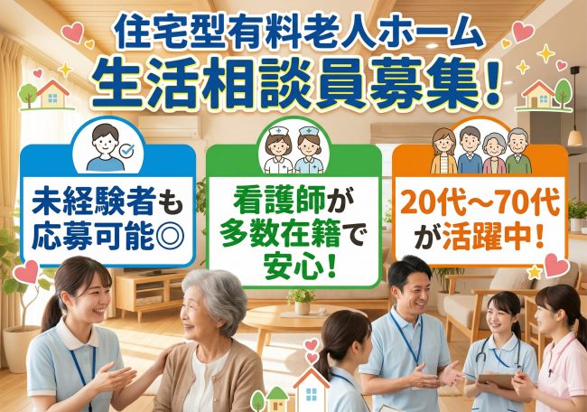 | 仕事内容 | ★住宅型有料老人ホームそらの苑★ ・相談員業務:報告書、計画書などの書類記入 ・介護業務:入浴介助、食事介助、レクリエーション、トイレ誘導、おむつ交換、書類、掃除等 |