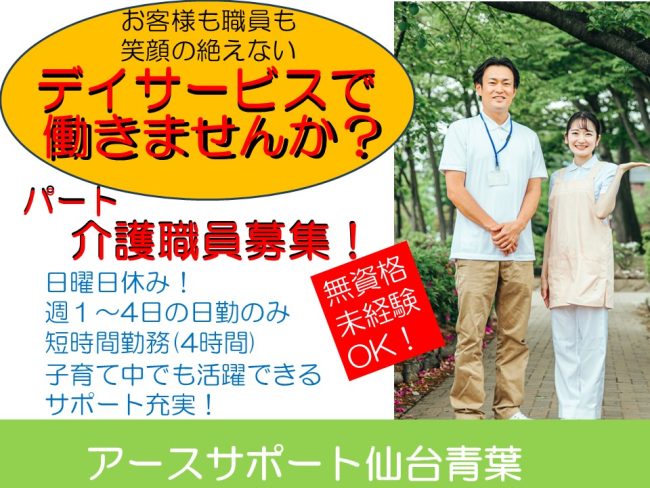 | 仕事内容 | ★アースサポート仙台青葉★ 【具体的な仕事内容】 ◎デイサービスにおいて入浴介助、レクリエーションや移動の補助等のお仕事です♪ *お客様の笑顔をサポートして下さい♫ *介護の資格は問いません。未経験の方でも歓迎します! |