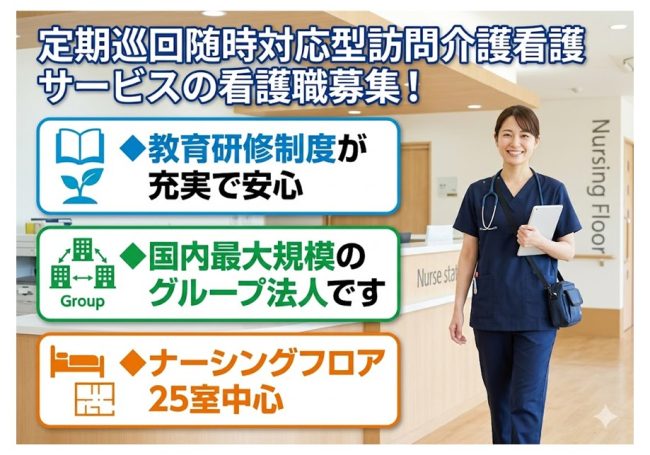 | 仕事内容 | ★グッドタイムサポート泉大沢★ ◎有料老人ホーム内に併設する、定期巡回随時対応型訪問介護看護サービス内での訪問看護業務 【主な業務】 ・サービス利用者の健康管理 ・指示書に基づく看護業務 ・訪問診療時の主治医対応 ・服薬管理、経管栄養、吸引 等 |