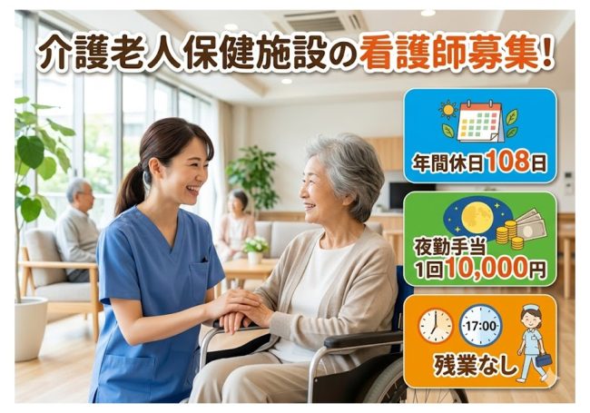 年間休日108日◎賞与あり!各種手当充実◎夜勤手当1回10,000円☆施設看護スタッフ募集!