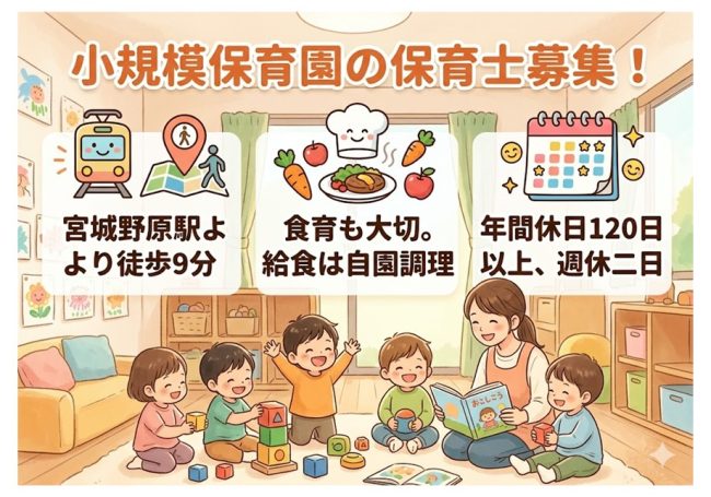 | 仕事内容 | ★スクルドエンジェル保育園 仙台宮城野原園★ ◎定員19名の認可保育園でのお仕事です。 少人数のため、子ども一人ひとりと丁寧に向き合えます。 保育士として、日々の保育・保護者対応などをお任せします。 <駅チカで、自然も感じられる環境> 駅から徒歩10分以内と通勤に便利な立地ですが、 周囲には公園もあり、四季を感じながら保育ができます。 <保護者・職員との信頼関係を大切に> 園内には、年間行事や1日の流れを1示し、 保育の“見える化”を行っています。 子育ての経験がある方も、ブランクがある方も歓迎です。 「家庭も大事にしながら働きたい」そんな想いを、応援します |