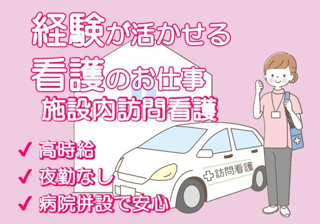 | 仕事内容 | ★訪問看護ステーションひろせ★ 併設する住居型有料老人ホ-ムの入居者様の居室を訪問し、療養上のお世話や医師の指示に基づく医療処置、病状の観察、タ-ミナルケア等を行います。 *エリア:青葉区(社用車使用) 主な訪問先(同敷地内の住居型有料老人ホ-ム) ※夜勤はありません。夜間オンコ-ルあります(別途手当有) ※同敷地内に広瀬病院があるため、医療機関との連携がとりやすくなっています。 |