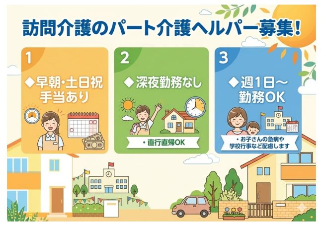 | 待遇 | ■早朝に勤務した場合:別途1時間200円手当を支給 ■土日祝日:訪問1回につき別途50円の手当を支給 ■通勤手当:実費支給(上限なし) ■社会保険完備 ■マイカー通勤可:駐車場あり ■資格取得支援あり ■正社員登用制度あり |