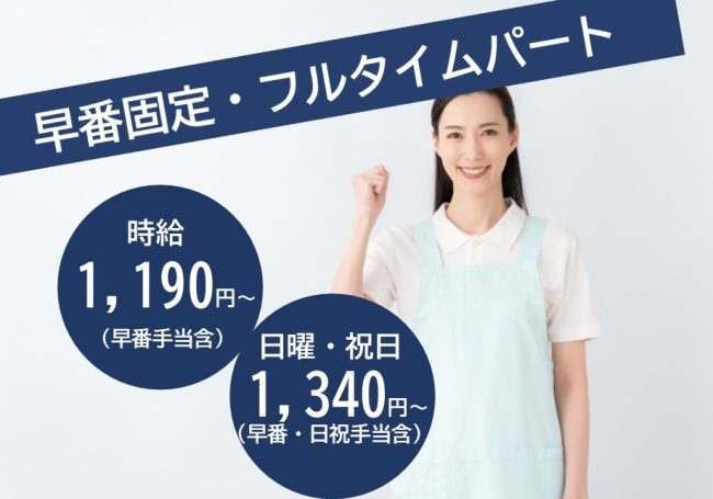 【早番固定・フルタイム】週3日~OK/学歴・年齢不問/日曜・祝日勤務できる方歓迎/ブランクOK/各種手当豊富/社会保険完備/資格取得支援あり/マイカー通勤OK