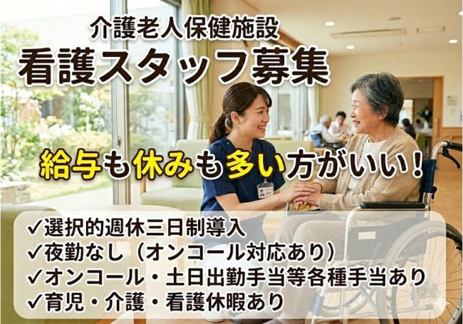 | 仕事内容 | ★介護老人保健施設春風のころ★ 〇看護業務全般 ・生活サポート ・高齢者の健康看護 ・一般的な看護業務 ・利用者が病院で受診する際の同行業務 |