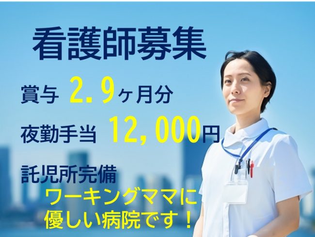 【正看護師】最寄駅より徒歩圏内/マイカー通勤OK/昇給・賞与あり/夜勤手当あり/住宅手当あり/家族手当あり/両立支援あり/育児・介護休暇あり/残業なし