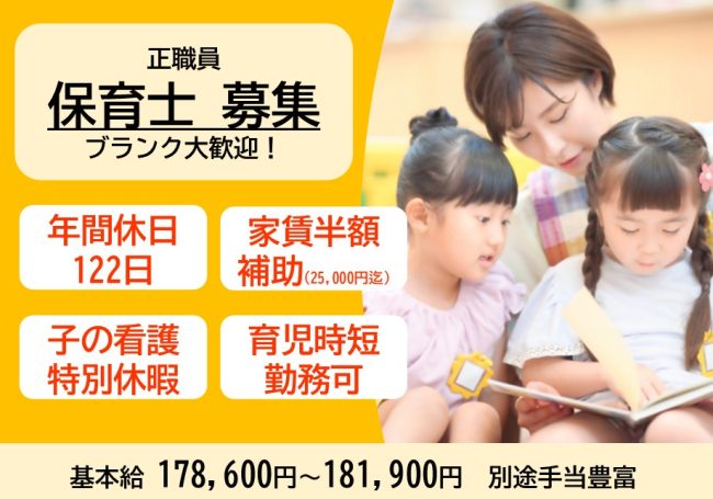 【保育士・幼稚園教諭】週休二日制/賞与3ヶ月分支給/各種手当・福利厚生充実/育児・介護・看護休暇あり/子どもたちの笑顔にパワーをもらいながら、楽しく働きませんか?保育士募集!