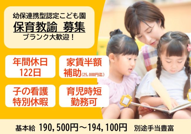 【保育教諭】週休二日制/賞与3ヶ月分支給/各種手当・福利厚生充実/育児・介護・看護休暇あり
