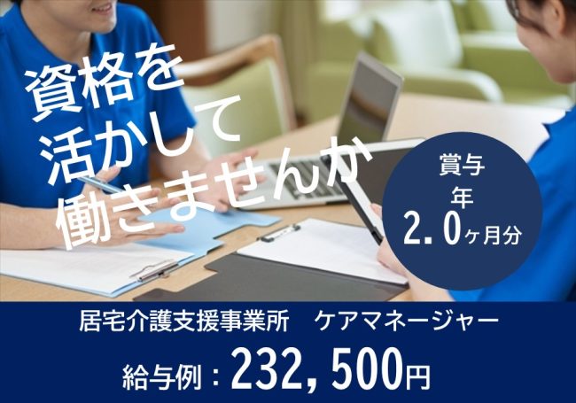【居宅ケアマネ】充実した各種手当・福利厚生/昇給・賞与あり/育児・介護・看護休暇あり/キャリアを活かしてみませんか!