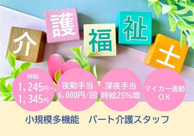 小規模多機能型居宅介護のパート介護職・ヘルパー/仙台市泉区松森flag小規模多機能型居宅介護のパート介護職・ヘルパー/仙台市泉区松森の詳細