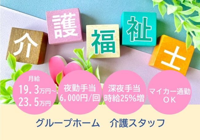 【介護福祉士】経験不問/週休二日制/昇給・賞与あり/夜勤手当あり/介護・育児休暇あり/研修制度充実で未経験でもOK