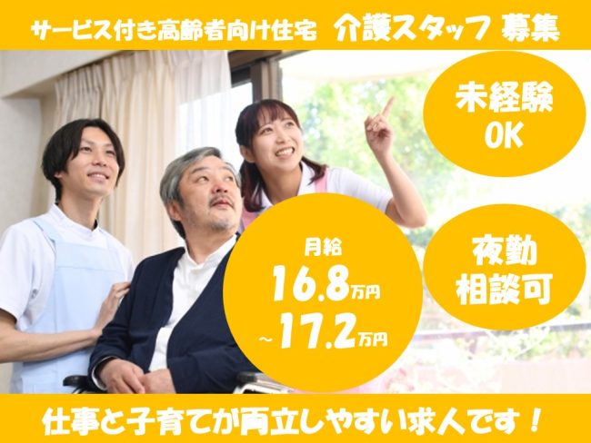 | 仕事内容 | ★フレンズハウス城慈★ ◎当社サービス付き高齢者向け住宅に居住している利用者様(高齢者・9名)の 身体介護と生活支援のお仕事です。 【詳しいお仕事内容】 *食事・排泄・入浴などの日常生活の介助 *レクレーションの実施 *健康管理の支援などの業務を主に行っていただきます。 ※夜勤ができない方はご相談ください。 |