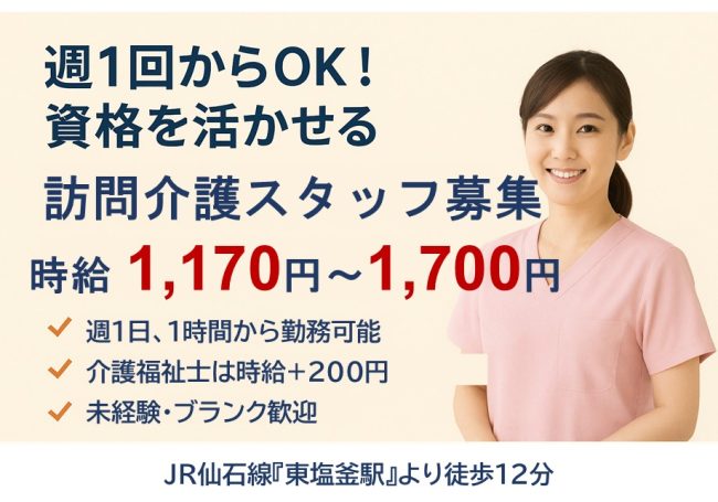 | 仕事内容 | ★ヘルパーステーション東雲★ ◎サービス付き高齢者向け住宅に入居されている高齢者及び在宅高齢者、障害者に対する訪問介護業務、食事、入浴、排せつ等の介助、 ・清掃、買い物代行、付添い、見守り等 *訪問エリア:仙塩地区、社有車(AT)あり *自家用車での訪問使用時は別途手当支給 ☆初めは同行の上、業務をおぼえていただきますので未経験の方でもご安心ください。 |