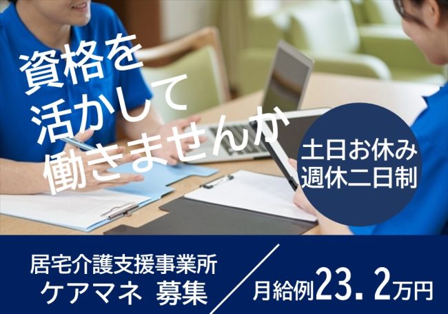 【ケアマネ】日勤のみ/充実した各種手当・福利厚生/土日固定給の週休二日制/育児・介護・看護休暇あり/キャリアを活かしてみませんか!