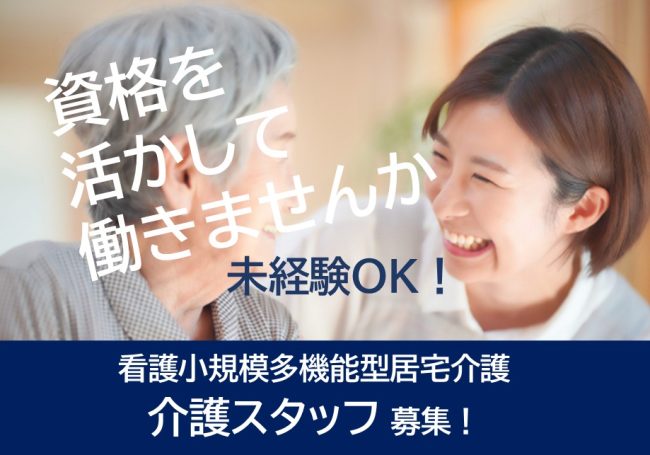 | 仕事内容 | ★包括ケアステーション べルカナ★ 〇2023年7月にオープンした看護小規模多機能型居宅介護事業所でのお仕事です。 【具体的な仕事内容】 ・在宅生活のをしている利用者に対し、住み慣れた地域での暮らしを継続することを目的として、通所介護、訪問介護、ショートステイを包括的に実施します。 ・生活介護(本人の暮らしへの支援)、身体介護(食事、入浴、排泄等)、レクリエーション活動、地域活動など他職種と連携しながら展開し、よりよいケアと地域づくりを行います。 *転勤の可能性あり:仙台市宮城野区・若林区(希望応相談) |