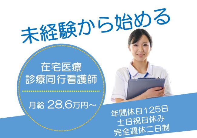 患者様の増加に伴い、当診療所では看護業務全般をお任せできる方を募集中です。患者様宅にはドクターや診療アシスタントと3名一組で訪問します。