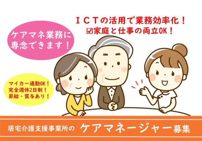 | 事業内容 | 介護全般のご相談に応じ、ケアプランの作成を行うケアマネージャーのお仕事です。 ケアマネジャーはご利用者さまの状態やご家族の要望をおうかがいし、ケアプランを作成します。 |