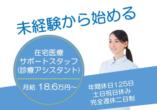 ・「診療アシスタント」は訪問診療の準備や診療サポートといった質の高い医療サービスを提供するためのコーディネートを行う縁の下の力持ちです。事務所でのデスクワークなどではなく、医師・看護師と患者様のもとに伺い診療をバックアップしたり、ご家族の相談に乗ったり、院内で診療のための準備をするなどとても活動的な仕事です。