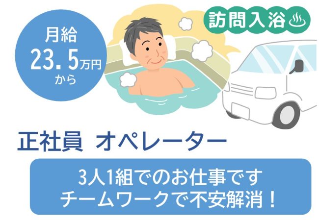 - 訪問入浴オペレーターを募集中です。お仕事についてはマンツーマンで指導します。介護のお仕事がはじめての方、ブランクがある方もご安心ください◎