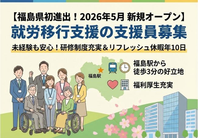 | 仕事内容 | ★Rickeyクルーズ福島駅前 ★ ◎就労移行支援事業所における就労支援員業務 ※2026年5月に新規オープン予定! ■利用者の強みを見つける面談、個別支援計画の策定補助 ■オープニング業務全般:利用者募集向けた周知活動 ■企業見学・体験・実習等への同行・調整 ■就職後の職場定着サポート、関係機関との連携 等 【福島初出店!】オープニングスタッフ募集! これまでのノウハウと充実の研修があるため未経験の方も安心! 「ゼロからの事業所づくり」に挑戦できます! 社会人経験を活かし、福島の就労支援を盛り上げましょう! *転勤の可能性あり:会社の定める事業所 |