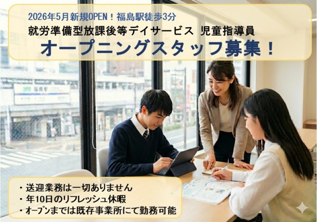 | 仕事内容 | ★就労準備型放デイ RRickeyアカデミー福島駅前★ ◎「就労準備型」放課後等デイサービスにおける児童指導員業務♪ ※2026年5月に新規オープン予定!オープニングスタッフ募集 ※オープンまでは既存事業所にて勤務することも可能です ■中高生の放課後活動のサポート(宿題・PC・マナー・SST等) ■一人ひとりの「得意」を見つける面談や日々の支援 ■社会を知るための社会参加活動同行、イベントの企画・運営 ■ご家族とのやりとり、日々の活動記録作成 等 ※就労準備型放デイの為、送迎業務は一切ありません 経験を活かしてゼロから事業所づくりに携われるやりがい! 研修やサポート体制が充実!こどもが好きな方大歓迎です! 新規立ち上げで「理想の事業所」を一緒に創り上げてみませんか? ・運営会社の株式会社ミツイは、社員約200名で保育事業/障害児・者向け事業/介護事業/コンサル事業を運営 *転勤あり:会社の定める営業所 |