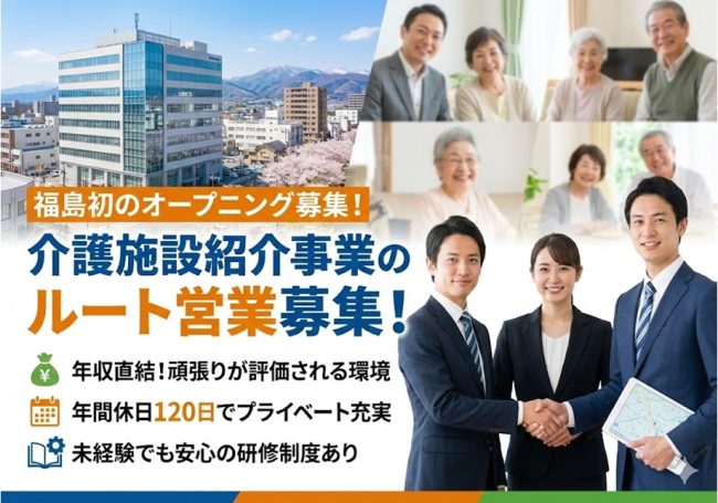 | 仕事内容 | 【居宅介護支援事業所や病院への訪問(ルート営業)】 ・施設をお探しの方/ご家族様との面談・ご希望のヒアリング ・条件に合う施設情報の収集、提案書の作成・ご説明 ・施設見学のセッティング、同行フォロー、入居までのサポート ※2026年4月新規オープン予定!オープニングスタッフ募集! ◎宮城問い合わせ件数NO.1の介護施設紹介センターが福島初出店! ・年間1500件以上の相談実績を誇る安定企業! ・未経験から「紹介のプロ」へ。頑張りは年収へ直結! ・地域の医療・介護業界を支えるやりがいある仕事です ・入社後は充実の研修があるため、介護知識がない方も安心 ・福島支店の立ち上げメンバーとして職場を一緒に作りませんか? |