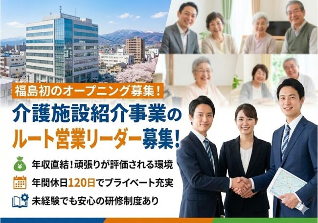 | 仕事内容 | 【居宅介護支援事業所や病院への訪問(ルート営業リーダー職)】 ・リーダーとして同僚相談員のサポート業務 ・施設をお探しの方/ご家族様との面談・ご希望のヒアリング ・条件に合う施設情報の収集、提案書の作成・ご説明 ・施設見学のセッティング、同行フォロー、入居までのサポート。 ※2026年4月新規オープン予定!オープニングスタッフ募集! ◎宮城問い合わせ件数NO.1の介護施設紹介センターが福島初出店! ・年間1500件以上の相談実績を誇る安定企業! ・未経験から「紹介のプロ」へ。頑張りは年収へ直結! ・入社後は充実の研修があるため、介護知識がない方も安心 ・福島支店の立ち上げメンバーとして職場を一緒に作りませんか? |