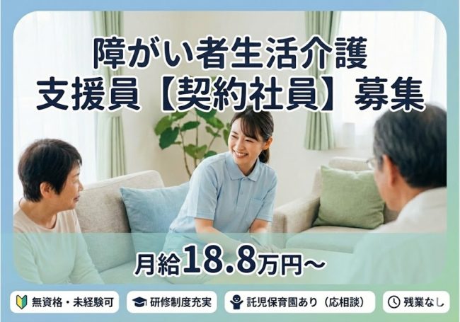 今回、支援員として障がいのある方の作業の見守りとお手伝い、送迎業務等を担当していただく契約社員を募集しています。