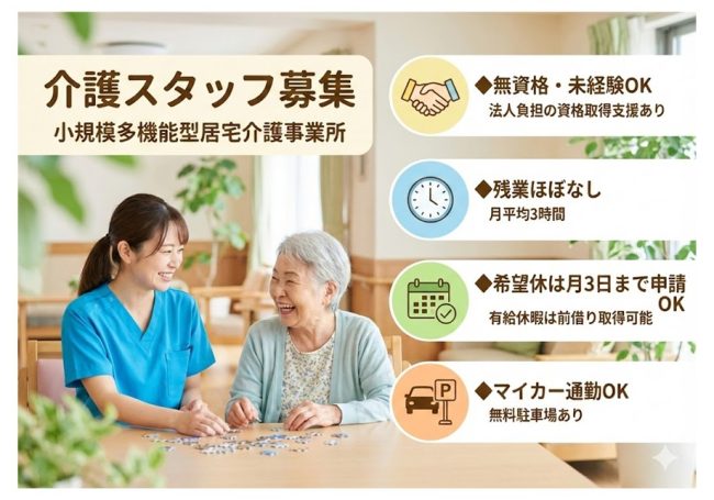 実際に、無資格・未経験からスタートした職員も多く、先輩職員が一つひとつ丁寧に教える体制が整っています。分からないことは何度でも確認しながら、少しずつ仕事を覚えていける環境です。 小規模多機能型居宅介護のため、「通い」「訪問」「泊まり」を組み合わせた支援を行っていますが、訪問業務も身体介護が中心ではありません。買い物の付き添いやお弁当配達、服薬確認、見守りなど、生活支援がメインとなっています。 当事業所で大切にしているのは、利用者様を “ 自分の家族 ” のように思って関わることです。親や身内に接するような気持ちで向き合い、現実的に可能な希望であれば、できる限り叶えてあげたいと考えています。お一人おひとりに寄り添う介護を、事業所全体で目指しています。 また、相手の立場に立って話をよく聞くこと、元気に明るく挨拶することも大切にしています。こうした姿勢が、利用者様の安心だけでなく、職場全体の雰囲気づくりにもつながっています。 職員に対しても、何でも言いやすい雰囲気を重視しています。意見や相談を遠慮なく話せるよう、日常の中で自然にコミュニケーションが取れる関係性を大切にしています。資格や経験よりも、人に寄り添う気持ちを大切にしたい方に、ぜひ来ていただきたい職場です。