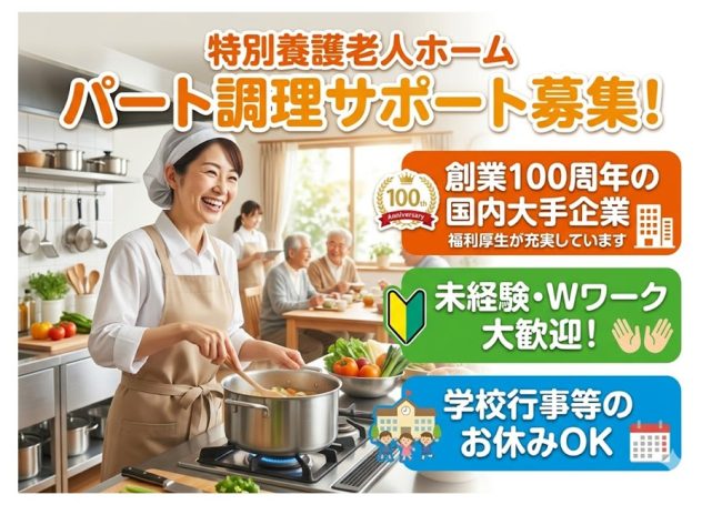 | 仕事内容 | ★特別養護老人ホーム 寿光荘 内厨房★ ◎福祉施設内厨房での調理サポートのお仕事です 【具体的な仕事内容】 ・調理サポート(仕込作業、食事の盛付) ・配膳作業 ・洗浄作業 など ☆午後からの勤務、Wワーク・副業OK♪未経験からスタートした方もたくさんいます♪ |