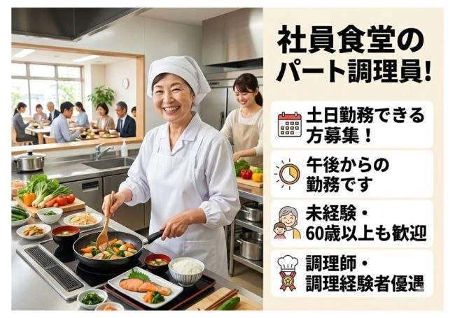 午後から勤務!未経験・60歳以上も歓迎!調理師・調理経験者優遇◎週5日程度の調理員♪土日勤務できる方募集!