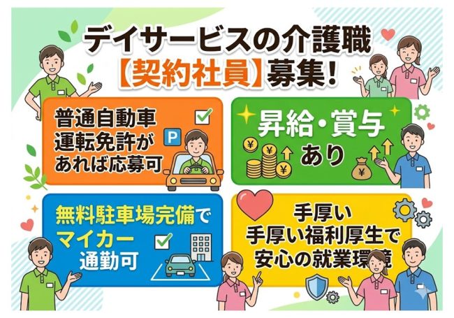 | 待遇 | ■扶養手当 ・配偶者 10,000円/月 ・子供 3,000円~/月 ■住宅手当:上限15,000円/月 ■送迎運転手当:150円/回 ■送迎運転助手手当:100円/回 ■介護福祉士手当:5,000円/月 ■賞与とは別に処遇改善加算金を年2回一時金として支給(6、12月) ■通勤手当:実費支給(上限あり)19,000円/月 ■社会保険完備 ■マイカー通勤可:駐車場あり ■育児休業取得実績あり ■制服貸与 ■予防接種実施 ■健康診断(年2回) ■病気、怪我等で長期休業になった場合の補償制度充実 ■永年勤続者への表彰制度あり |