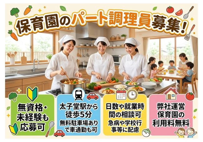 | 仕事内容 | ★りっきーぱーく保育園あすと長町★ ◎保育園の調理業務 【具体的な仕事内容】 ・0歳~2歳の19名の食事やおやつ作り→お子様が好きな方大歓迎です! ・無料駐車場完備(マイカー通勤可) ・就業場所はJR太子堂駅徒歩約5分 ・書類選考前の見学、職場体験実施中 ・近隣保育園(車で約3分圏内)給食の運搬業務→こちらについては対応可能な方にお願いしております ※転勤の可能性あり:仙台市内の事業所等 |