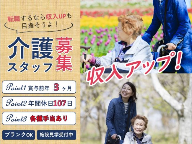 | 仕事内容 | ~1日の流れ~(日勤の場合) ①出勤・朝礼、ケアノート確認・申し送り ②午前の入浴介助・フロア見守り →その日によって入浴担当やフロア担当に分かれて、お客様の介助を行います。フロア担当者は排泄介助やリネン交換を行います。 ③食事準備・食事介助 →口腔体操などが終了したら、食事を配膳し、必要な方の介助を行います。スタッフも交換で休憩を行います。 ④午後の入浴介助・レクリエーション・おやつ →入浴担当者とフロア担当に分かれます。フロア担当者はレクリエーション・おやつのご提供・排泄介助等を行います。 ⑤記録チェック・夕食準備 →夜勤スタッフへの引継ぎを行います。夕食の時間頃から遅番スタッフがフロアに来ますので、業務が整理できれば日勤は終了です! ※早番(7:00~16:00)、日勤(8:30~17:30)、遅番(11:00~20:00)、夜勤(16:00~翌9:00)のシフトがございます。はじめから全ての業務をお任せするわけではございません。 早番はフロア業務、遅番は午後の入浴介助~夕食介助、夜勤は就寝準備・見守り・起床介助がメイン業務です。月5回程度夜勤シフトがあります。 未経験・分からないことは先輩スタッフがサポートしていきますので、ご安心ください! |