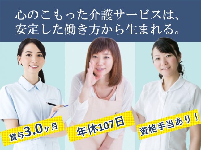 「共生を創る・健康を創る・生きがいを創る」の3つのコンセプトを軸に、スタッフ全員が資格所持者で、質の高い介護・看護を追求しています。専門職が多い職場なので、資格取りたての方・初めての介護の職場としてもオススメです!充実した研修体制をご用意しているため、一人ひとりに合う長期的なキャリアを築くことができます。