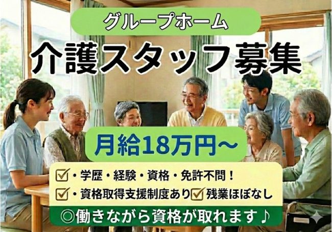| 仕事内容 | ★グループホームつばさ栄町★ ・利用定員18名のグループホーム ・食事、入浴、排泄等の介助及び掃除、洗濯等の生活支援 ・食事作りはチルド食品の加工のため、料理が苦手でも行えます。 ・未経験、経験が浅い方も安心して働くことができるよう指導致します(費用会社負担での資格取得支援制度あり) ・日中は利用者3名に対し職員1名以上配置 ・夜間は利用者最大18名に対し職員2名配置 ・人員基準プラスαの職員配置を行っており、 急な休み等にも対応しやすい体制になっています *入社時期はご希望により調整致します。 *入社後、早番・日勤・遅番で指導を受けながら業務に慣れていただき、その後通常の夜勤職員+1名の補助的夜勤(見習い夜勤)になっていただき、業務修得状況をみて正式夜勤の流れとなります。正式夜勤までの期間は個々の業務修得状況により判断致します。 |