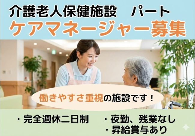 | 仕事内容 | ★介護老人保健施設 さくらパレス★ ◎土日祝日休み、介護老人保健施設でのさくらパレスでの施設ケアマネージャーのお仕事です。 ◎勤務時間、勤務日数についてはご相談ください。 *ケアプラン作成、モニタリング、アセスメント等 ※パソコン入力程度出来ればOK *ご利用者様、ご家族様との面談 *ケアプランに対する各種相談の対応 *介護認定の申請代行、認定調査 *各市町村やサービス事業者、ご家族様との連絡調整 |