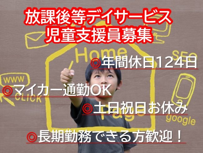 | 仕事内容 | ★ワクワクひろば泉★ ◎放課後等デイサービスにて、障がいを持つ小学生の療育を行い、基本的生活習慣の確立、生きる力、社会性の育成を目指します。 *各施設定員10名。 *小学校が終わってから放課後学校まで迎えに行きます。 *法人内での他施設への転勤の可能性あり。 |