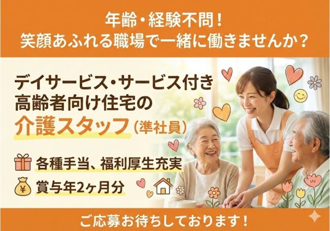 | 仕事内容 | ★ソーレホーム江俣★ ◎高齢者介護施設での介護業務全般(通い、泊り、訪問) ・併設している高齢者向け住宅での業務もあります。 ※施設外への訪問はありません。 *現在はデイサービスですが、2026年2月から小規模多機能型居宅介護事業所に変更予定です。 年内に入社される場合は、デイサービスで日勤を担当していただきます。 |