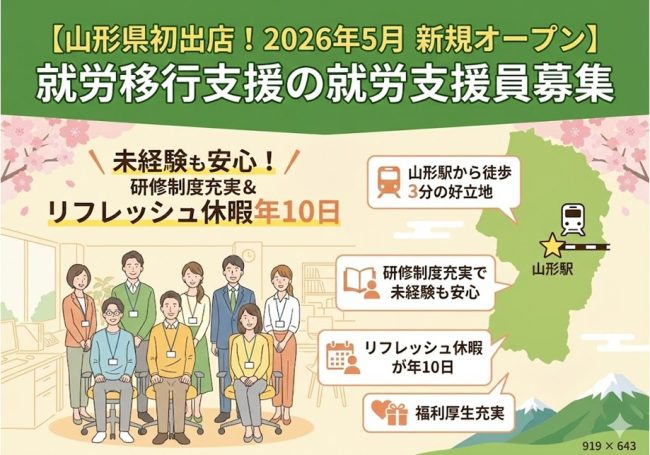 | 仕事内容 | 【就労移行支援事業所における就労支援員業務】 ※2026年5月に新規オープン予定! ■利用者の強みを見つける面談、個別支援計画の策定補助 ■オープニング業務全般:利用者募集向けた周知活動 ■企業見学・体験・実習等への同行・調整 ■就職後の職場定着サポート、関係機関との連携 等 【山形初出店!】オープニングスタッフ募集! これまでのノウハウと充実の研修があるため未経験の方も安心! 「ゼロからの事業所づくり」に挑戦できます! 社会人経験を活かし、山形の就労支援を盛り上げましょう! |