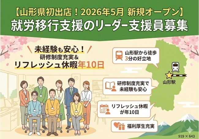 | 仕事内容 | 【就労移行支援事業所におけるリーダー支援員業務】 ※2026年5月に新規オープン予定! ■チームリーダー業務(業務進捗管理・スタッフ人材育成等) ■利用者のアセスメント、目標設定、個別支援計画の作成補助 ■オープニング業務全般:利用者募集向けた周知活動 ■企業見学等の同行、就職・定着に向けた支援プロセスの管理 等 【山形初出店!】オープニングスタッフ募集! これまでのノウハウと充実の研修があるため未経験の方も安心! 「ゼロからの事業所づくり」に挑戦できます! 社会人経験を活かし、山形の就労支援を盛り上げましょう! |