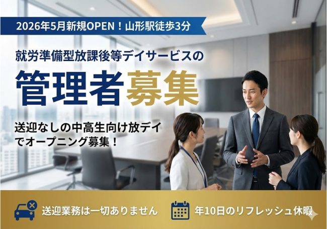 | 仕事内容 | 【「就労準備型」放課後等デイサービスにおける管理業務全般】 ※2026年5月に新規オープン予定!オープニングスタッフ募集 ■関係機関(行政・学校等)への広報および利用者募集周知 ■事業所の目標管理(稼働率向上)、支援プロセスの進捗管理 ■職員の採用・指導・育成、チームビルディング ■国保連への請求業務、行政対応、各種帳票の整備・管理 等 経験を活かしてゼロから事業所づくりに携われるやりがい! 研修やサポート体制が充実!マネジメントを学びたい方に最適! 新規立ち上げで「理想の事業所」を一緒に創り上げてみませんか? |