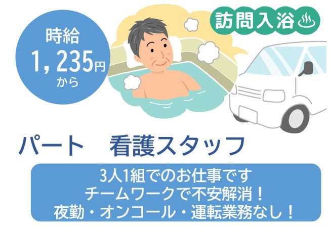 | 仕事内容 | ★アサヒサンクリーン在宅介護センター大河原★ ◎看護スタッフとして業務に従事していただきます ・看護職員1名と介護職員2名の3名1組での仕事 ・主な仕事はバイタルチェック・着脱・処置、3人での入浴介助 (運転業務や浴槽設置などは介護職員が行う) ・一日の訪問件数は平均6-7件程度 ・電子カルテを使用 ・処置は軟膏塗布が主で、注射や点滴・痰吸引などの重大な医療行為無し ☆週1日~可/土日定休日/夜勤・オンコール・運転業務無し ☆正社員登用あり ☆研修後も業務に慣れるまでは先輩看護職員と共に4名1チームで訪問 |