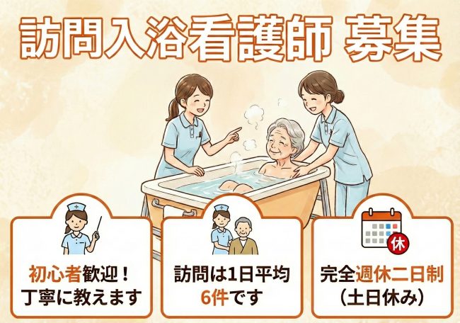 | 仕事内容 | ★アスケア訪問入浴 亘理★ 看護スタッフとして業務に従事していただきます♪ 【具体的な仕事内容】 ・看護職員1名、介護職員2名の3人1チームで、お客様のお宅へ 訪問しての入浴介護です。 ・主な仕事はバイタル測定、入浴可否判断、電子カルテなので記録などはありません。 ・お客様が快適に入浴できるようコミュニケーションをとります。 ・入社後は東北支店で3日間の研修を行います。 |