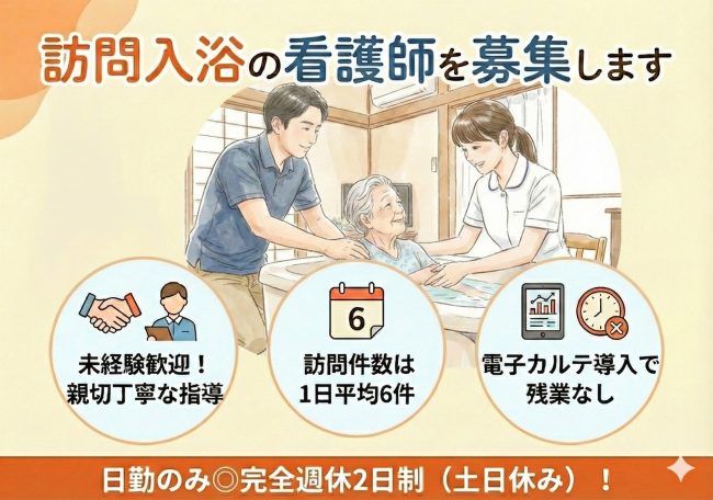 | 仕事内容 | ★アスケア訪問入浴 登米★ ◎訪問入浴車両で各ご自宅を訪問し移動式浴槽を用い、安全で快適に入浴して頂くサービスです。 ・看護職員1名と介護職員2名の3名1組での仕事 ・主な仕事は、バイタルチェック・着脱・処置、3名での入浴介助 (運転業務や浴槽設置などは介護職員が行う) ・処置は軟膏塗布が主で、注射や点滴といった医療行為無し ☆研修後も業務に慣れるまでは先輩看護職員と共に4名1チームで訪問するため、経験年数の少ない方も安心です。 *転勤の可能性あり:原則無し、本人希望ある場合のみ他事業所への異動可能 |